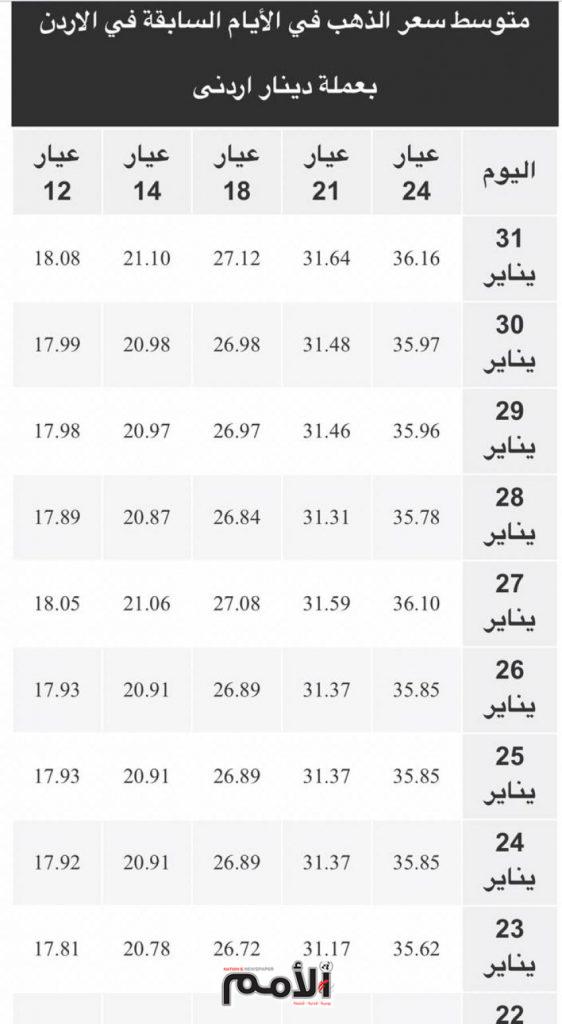 وتحتوي أيضا علي مخطط بمعدل الارتفاع والانخفاض في اسعار الذهب اليوم في الاردن في الأيام السابقة في السوق الأردني.