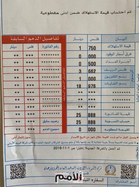 0 قيمة فاتورة كهرباء السفارة اللبنانية في عمان