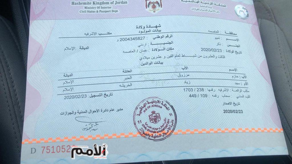 وأوضح العنبر في تصريح صحفي لـ”الأمم” : انه قام اليوم بتسجيل مولوده الصغير لدى دائرة الأحوال المدنية والجوازات.