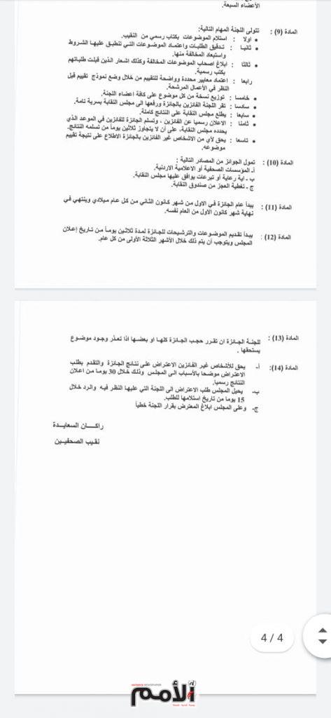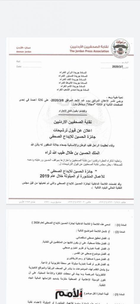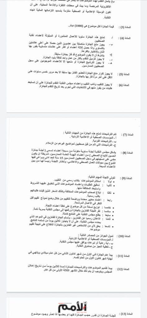 ويذكر ان التعديلات  جاءت بهدف تجويد وتنقيح بعض الاختلالات بما ينسجم مع الحيادية والشفافية التي تقتضيها طبيعة عمل الجائزة وفاء لعظيمنا الراحل فقيد الوطن والانسانية جمعاء جلالة المغفور له باذن الله الملك الحسين بن طلال طيب الله ثراه وتخليدا لذكراه العطرة وتقديرا من نقابة الصحفيين واعتزازها بمواقف الحسين ورعايته ودعمه للصحافة .