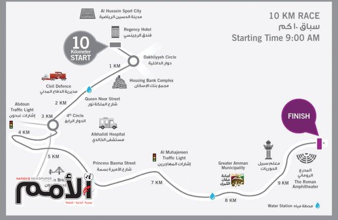 أما بالنسبة لسباق الـ10 كيلو مترات والذي ينطلق في الساعة التاسعة صباحاً، فسيتم اغلاق مسار السباق كليا في الساعة السادسة صباح الجمعة ولغاية الساعة الثانية عشر ظهراً، ويشمل ذلك اغلاق شارع الملكة علياء ما بين دوار الداخلية ودوار المدينة الرياضية بشكل تام، بالإضافة إلى شارع الملكة نور ما بين دوار الداخلية والدوار الرابع، كما سيتم اغلاق شارع عقبة بن نافع وشارع الأميرة بسمة وشارع عمر مطر وشارع علي بن ابي طالب وشارع قريش بشكل كامل. (بترا)