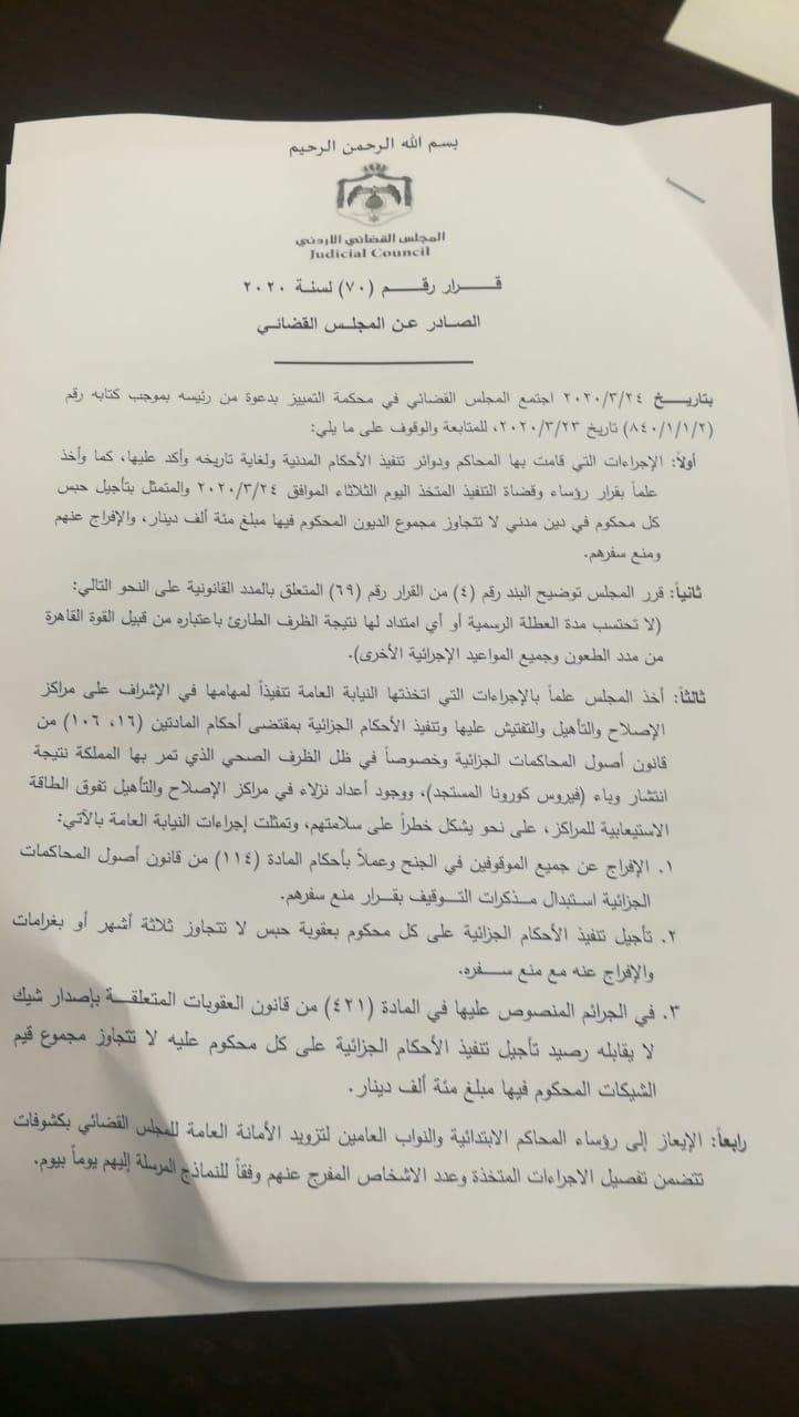 جاء ذلك خلال اجتماع عقده المجلس القضائي في محكمة التمييز برئاسة رئيسة رئيس محكمة التميز محمد الغزو وذلك استكمالاً للإجراءات القضائية المتخذة من قبل السلطة القضائية ممثلة بالمجلس القضائي والمحاكم النظامية والنيابة العامة للمساهمة في دعم الجهود الوطنية للحد من انتشار فيروس كورونا المستجد، وبما لا يخل بمصلحة المجتمع وحقوق المشتكين والمجني عليهم في القضايا الجزائية والمحكوم لهم في القضايا المدنية وتحقيقاً لمقتضيات المصلحة العامة.