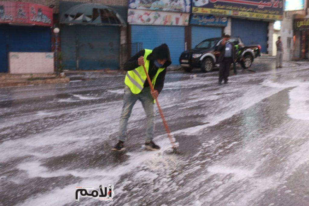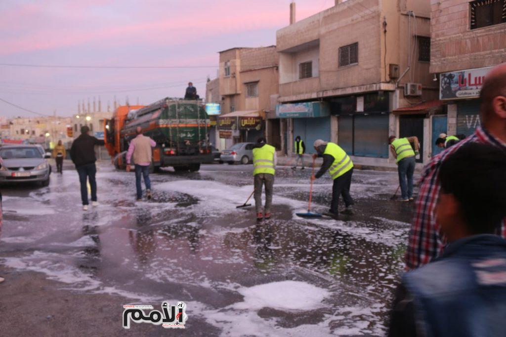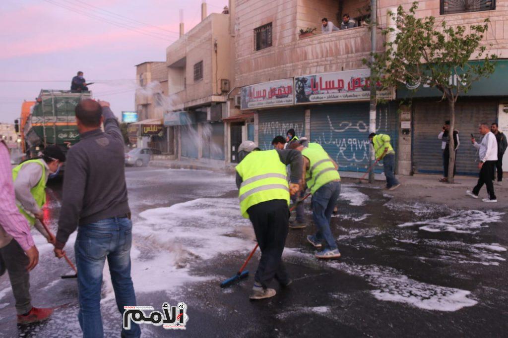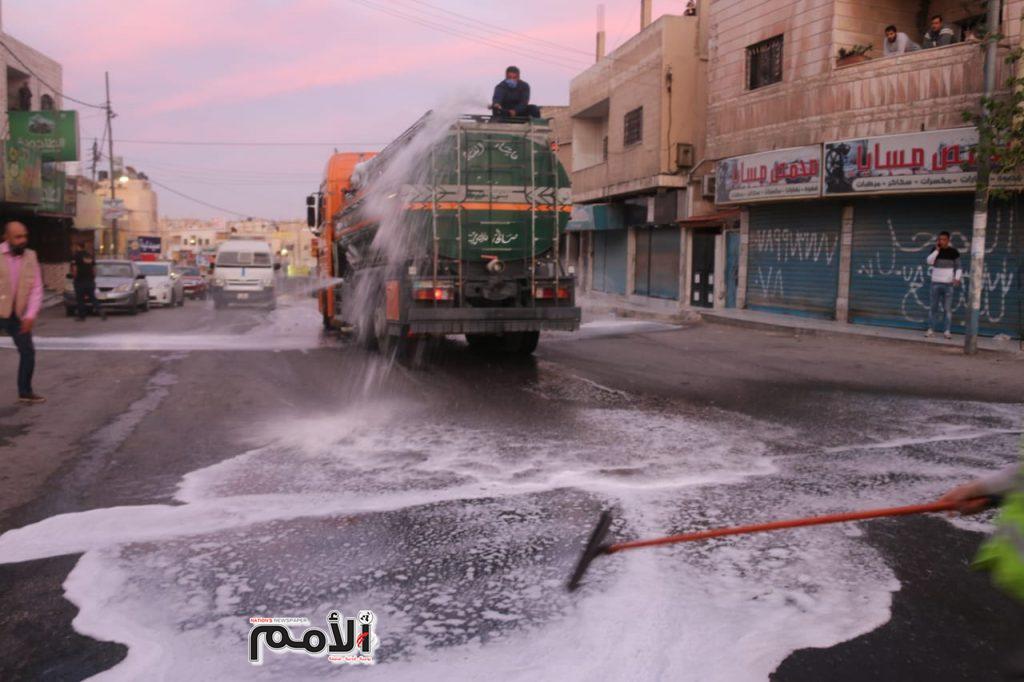 وقال الناطق الاعلامي في بلدية الزرقاء ينال المعاني ان كوادر البلدية باشرت بغسيل الشوارع بالمياه ومواد التنظيف والمعقمات .
