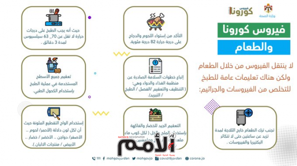 وبينت الوزارة ضرورة اتباع خطوات السلامة الصادرة عن منظمة الغذاء والدواء كالفصل والتبريد وتنظيف وتعقيم كل الأسطح المستخدمة في عملية الطبخ من خلال الكحول الطبي.