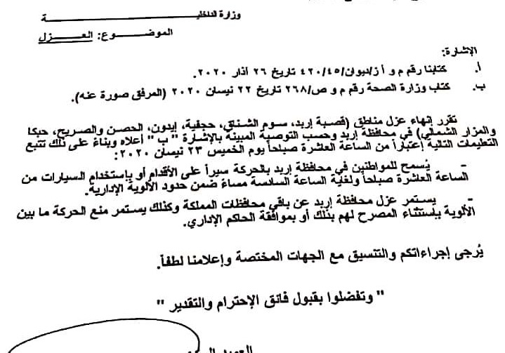 كما أعلن السماح للمواطنين في اربد باستخدام مركباتهم للتنقل ضمن حدود الالوية الادارية من الساعة العاشرة صباحا وحتى السادسة مساء، أي داخل الالوية فقط ولا يمكن مغادرة اللواء الا بموافقة.
