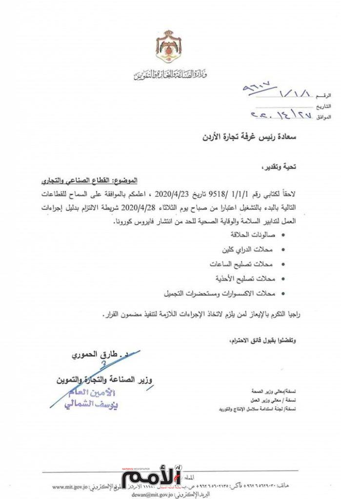 وحسب كتاب حلصت عليه من مصا، فانه يسمح لمحال صالونات الحلاقة والدراي كلين وتصليح الساعات وتصليح الاحذية، ومحلات مستحضرات التجميل والاكسسوارات بالعمل، عملاً ان ساعات العمل تكون خلال فترة العمل من الساعة 8 وحتى السادسة.