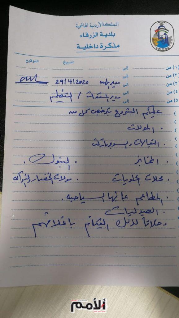 وقال الناطق الاعلامي في بلدية الزرقاء ينال المعاني بأن رئيس البلدية اوعز لمدراء دوائر رخص المهن والمسقفات والتنظيم باستئناف العمل اعتباراً من يوم غد الاربعاء لغايات الشروع بترخيص المنشآت الغير مرخصة .