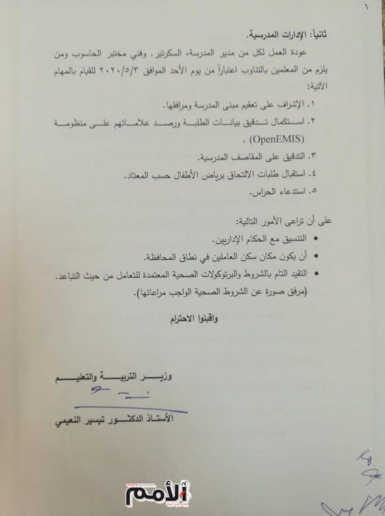 وأشار الكتاب إلى استئناف دوام كل من؛ مدير المدرسة والسكرتير وفني مختبرات الحاسوب ومن يلزم من المعلمين بالتناوب، اعتبارا من يوم الأحد الموافق 3/5/2020، للقيام بالأعمال التالية: