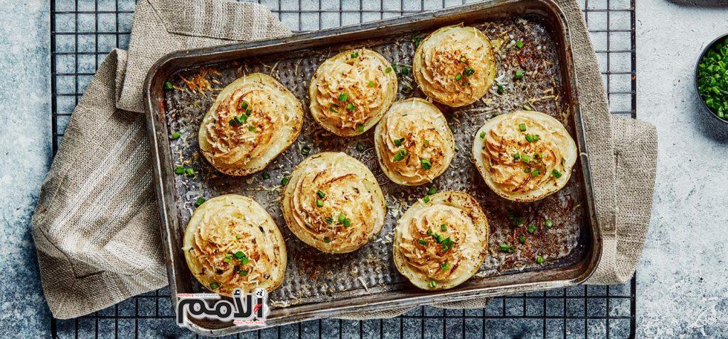 تُرش جبنة بارميزان فوق كل نصف حبة بطاطا ثم تُخبز البطاطا في فرن لمدة 10 دقائق أو حتى تصبح ذهبية من الأعلى