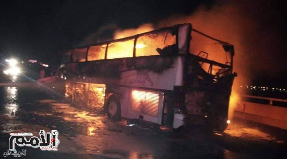 وأشارت المصادر إلى أن النيران اشتعلت في حافلة المعتمرين، وأسفر الحادث عن وفاة أكثر من 30 شخصا وإصابة 5 آخرين تم نقلهم إلى مستشفى الحمنة ووادي الفرع.