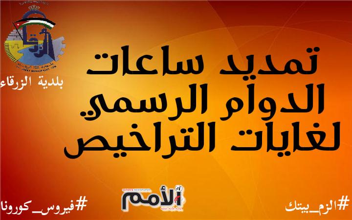 قرر المهندس عماد المومني رئيس بلدية الزرقاء تمديد عمل ساعات الدوام الرسمي المعنيه برخص المهن لغاية الساعه ٦ مساءً.