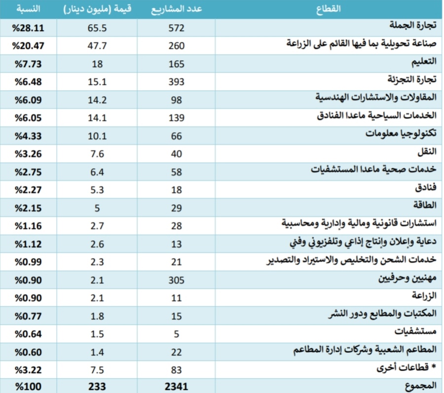 وفيما يتعلق بالتوزيع القطاعي للقروض الموافق عليها ضمن البرنامج، يلاحظ أن قطاع تجارة الجملة والتجزئة تلقى ما نسبته 34.6% من قيمة القروض الموافق عليها، تلاه قطاع الصناعات التحويلية بنسبة 20.5%، ثم قطاع التعليم بما نسبته 7.7%. وتوزعت الطلبات الموافق عليها ضمن البرنامج قطاعياً كما يلي: