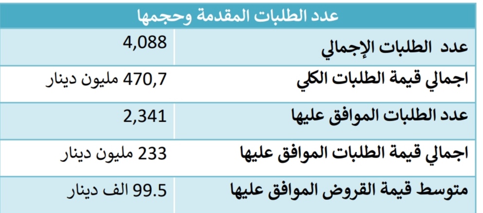 وأضاف البنك المركزي، في بيان له، أنه تمت الموافقة، حتى الان، على 2,341 طلباً بقيمة 233 مليون دينار أي ما نسبته 57.3 بالمئة من عدد الطلبات المقدمة ويجري دراسة الطلبات المتبقية وفقاً للمعايير المحددة للبرنامج.