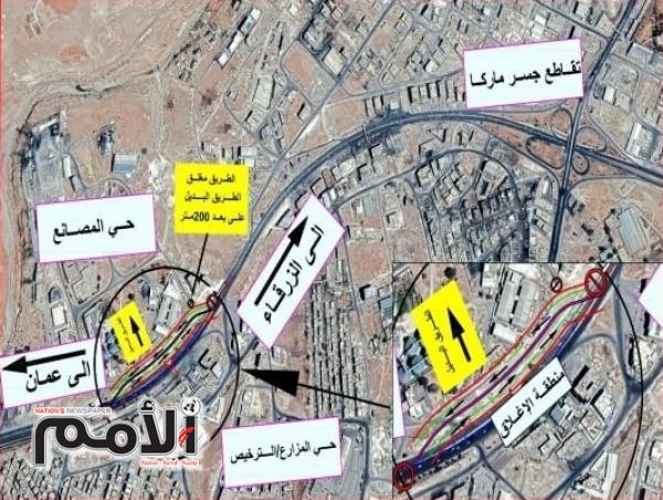 وقررت وزارة الاشغال تحويل السير القادم من عمان بإتجاة الزرقاء / الانحراف يسار بعد جسر المشاة – جسر المصانع المجاور لمحطة توتال والاستمرار حتى مصنع الحسام للصناعات البلاستيكية والعودة لطريق الأوتوستراد .