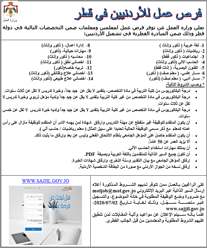 أعلنت وزارة العمل عن توفر فرص وظيفية لمعلمين ومعلمات أردنيين في دولة قطر تنفيذاً للمبادرة القطرية لتشغيل الأردنيين في قطر.