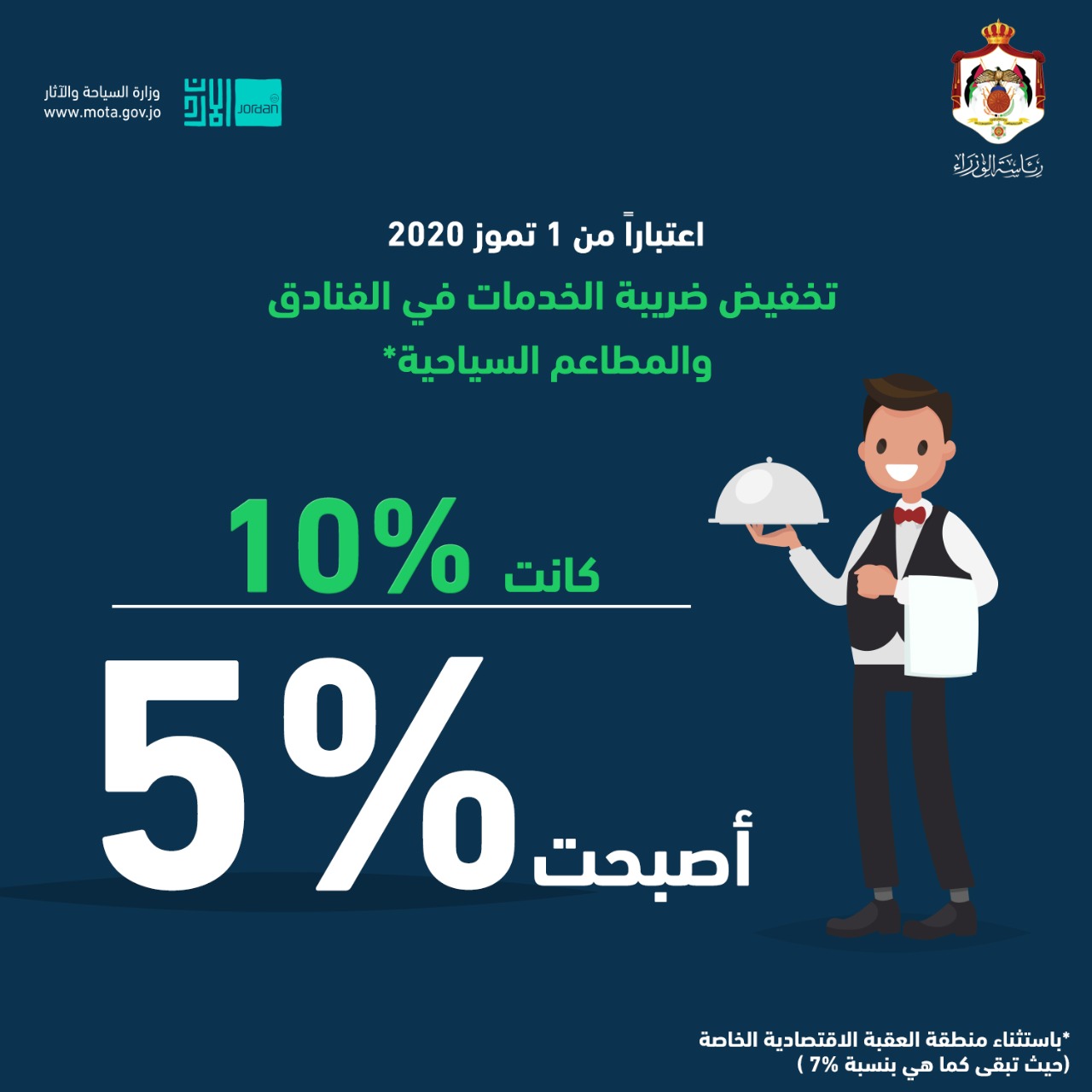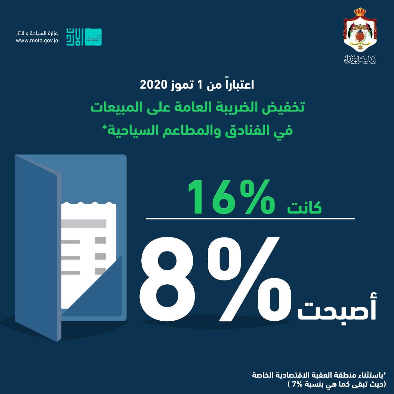وكانت أعلنت وزيرة السياحة والآثار مجد شويكة اجراءات لحماية القطاع السياحي تقضي بتخفيض الضريبة العامة على المبيعات للفنادق والمطاعم السياحية إلى 8% بدلاً من 16%، باستثناء منطقة العقبة الاقتصاية الخاصة حيث تبقى كما هي بنسبة 7%.