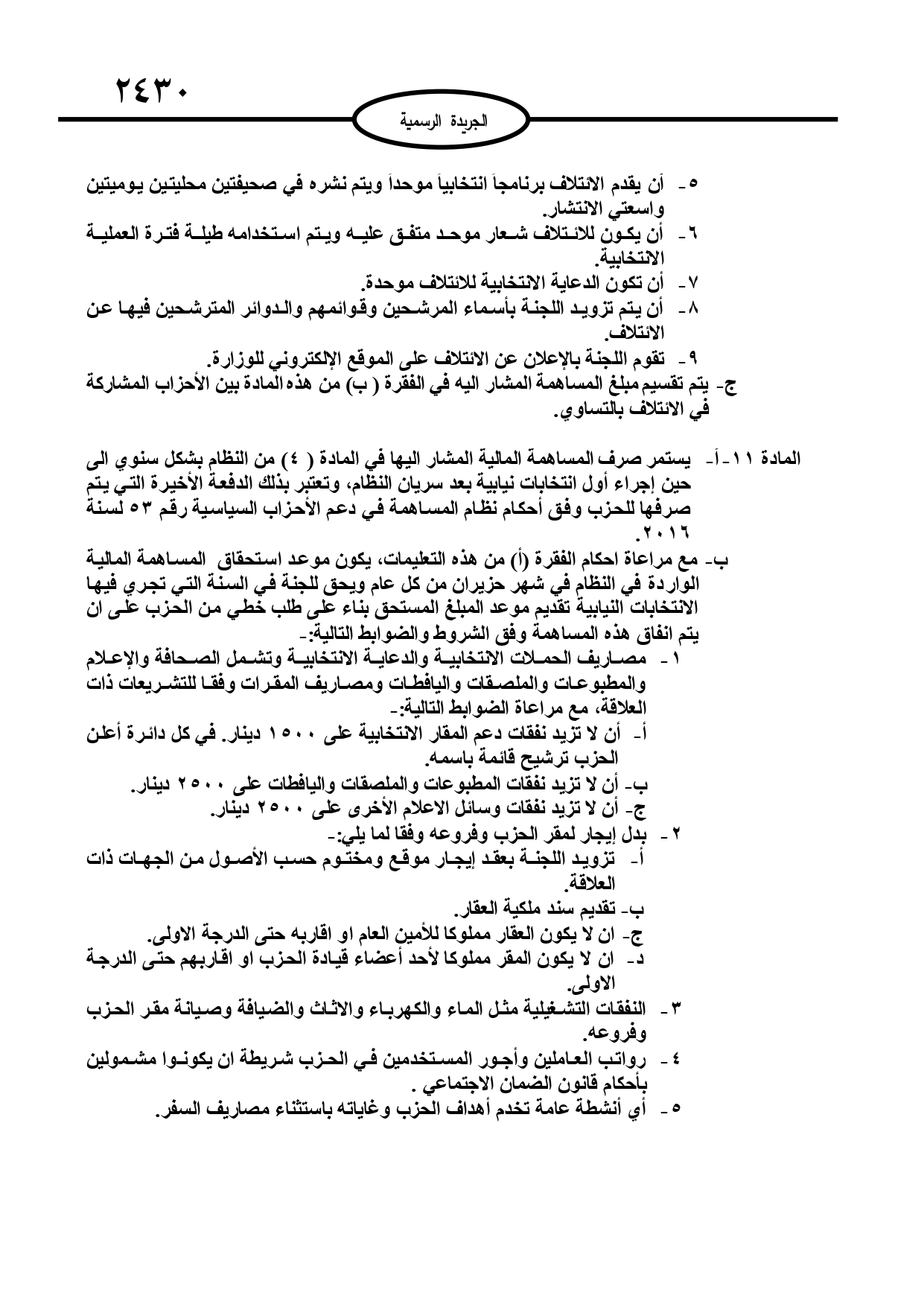 وبحسب التعليمات، يستحق الحزب السياسي مساهمة مالية لا تتجاوز نسبتها 40% من قيمة اشتراكات الاعضاء المحصلة والمودعة في البنوك على ان لا تتجاوز 10000 دينار