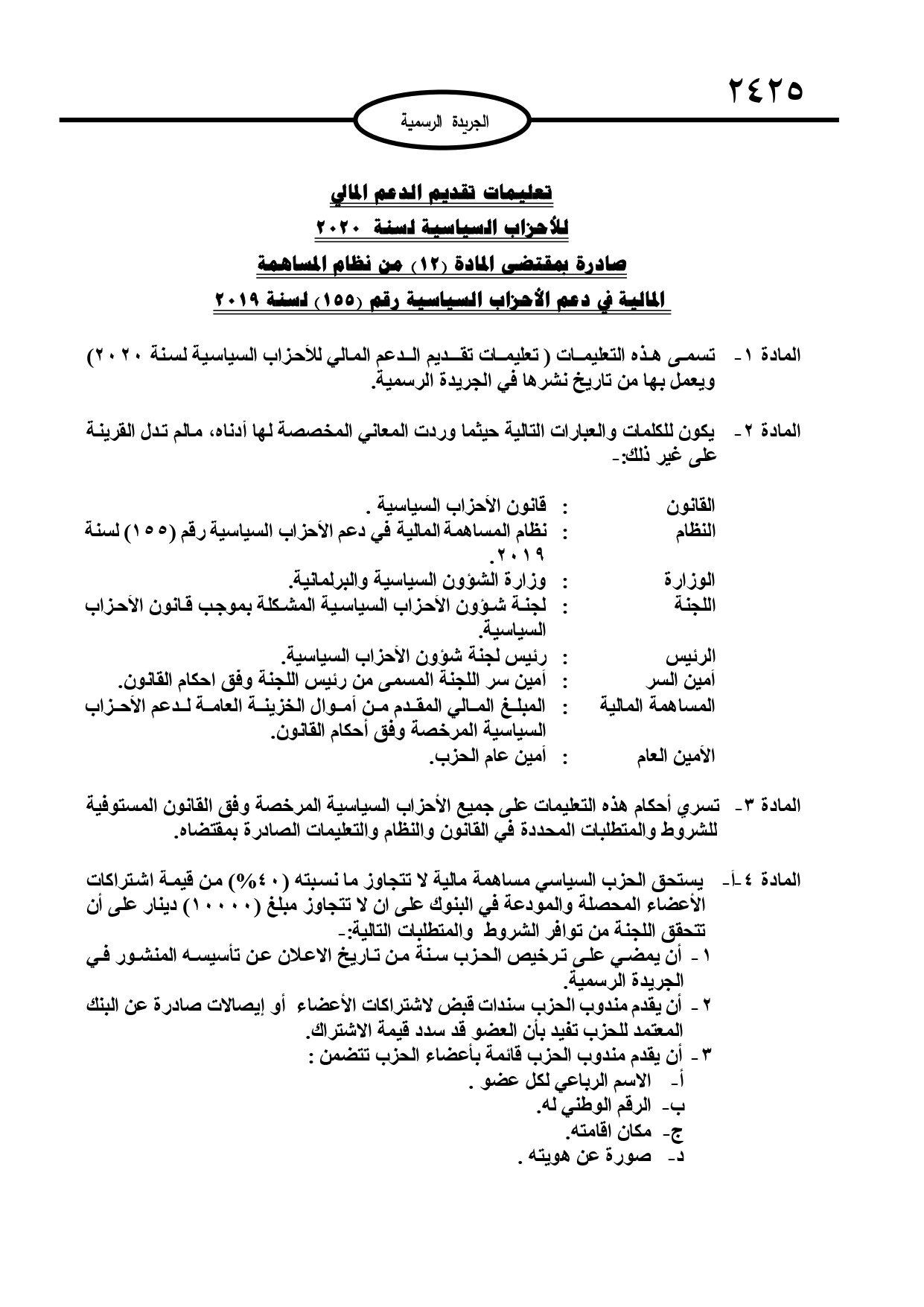 دخلت تعليمات تقديم الدعم المالي للأحزاب السياسية لسنة 2020 حيز التنفيذ بعد صدورها في عدد الجريدة الرسمية الاربعاء.