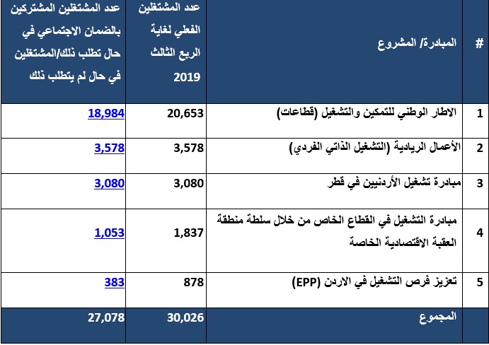 وبين البطاينة انه يتم اصدار التقارير الخاصة بالإطار الوطني للتمكين والتشغيل, والمبادرات والمشاريع الحكومية الأخرى, بشكل ربعي, حيث يتم حصر البيانات الخاصة بالمنتفعين والمشتغلين وتدقيقها, ومراجعتها من خلال بيانات المؤسسة العامة للضمان الاجتماعي، وذلك للتأكد من تسجيلهم بالضمان ولحصر اعداد المشتغلين الحقيقيين, مؤكدا ان المشتغلين ضمن مبادرة قطر, ومشاريع التشغيل الذاتي الممولة من صندوق التنمية والتشغيل غير خاضعين للضمان الإجتماعي.