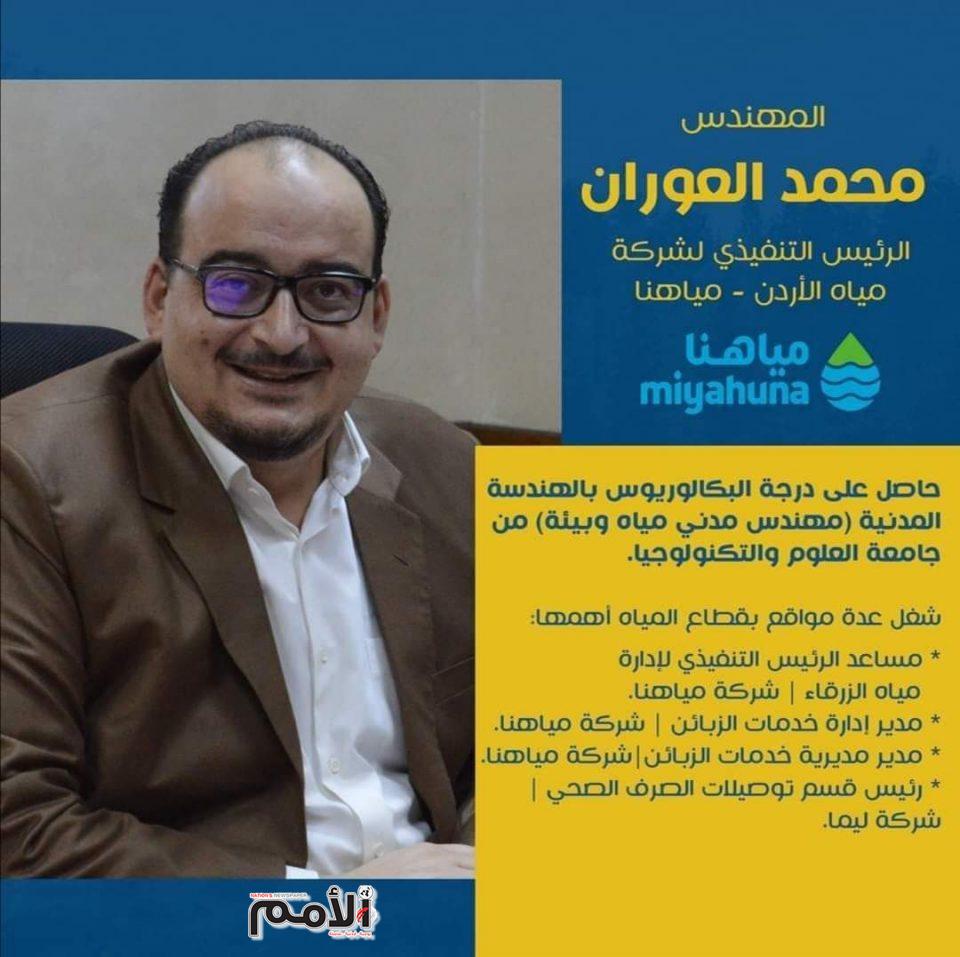 ، قررت هيئة المديرين لشركة مياهنا “مياه الأردن” برئاسة النائب الاسبق محمد ارسلان، تعيين المهندس محمد العوران رئيسا تنفيذيا لشركة مياهنا.