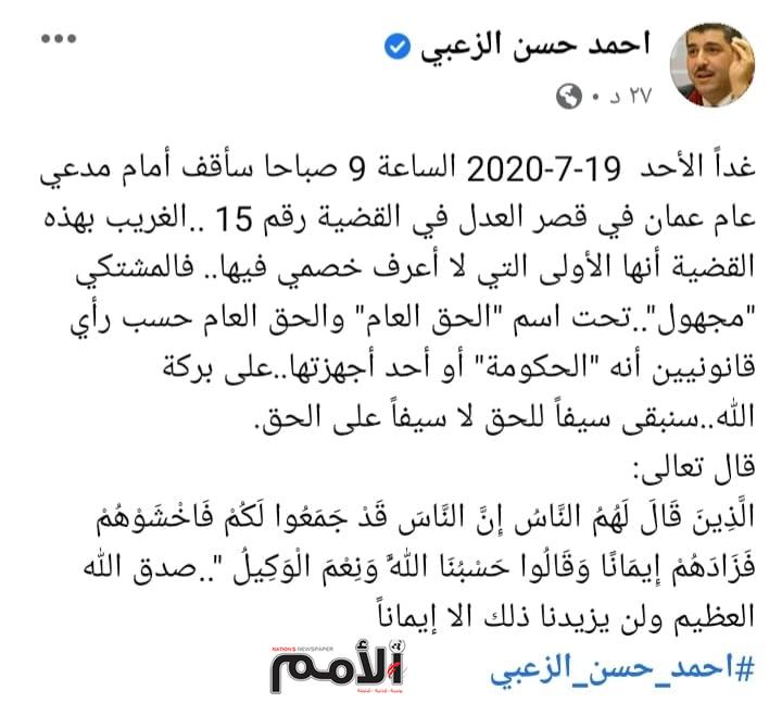 يمثل الكاتب والصحفي الأستاذ أحمد حسن الزعبي غدا الأحد أمام مدعي عام عمان في قصر العدل ، في القضية رقم 15 في تاريخه الصحفي والمهني كصحفي وصاحب موقع إخباري . وحسب منشور للزعبي عبر صفحته الرسمية في الفيسبوك ، فإن المشتكي مجهول ، تحت اسم الحق العام . وأضاف الزعبي في منشوره : على بركة الله..سنبقى سيفاً للحق لا سيفاً على الحق. قال تعالى: الَّذِينَ قَالَ لَهُمُ النَّاسُ إِنَّ النَّاسَ قَدْ جَمَعُوا لَكُمْ فَاخْشَوْهُمْ فَزَادَهُمْ إِيمَانًا وَقَالُوا حَسْبُنَا اللَّهُ وَنِعْمَ الْوَكِيلُ “..صدق الله العظيم ولن يزيدنا ذلك الا إيماناً . وتاليا منشور الزعبي : غداً الأحد 19-7-2020 الساعة 9 صباحا سأقف أمام مدعي عام عمان في قصر العدل في القضية رقم 15 ..الغريب بهذه القضية أنها الأولى التي لا أعرف خصمي فيها.. فالمشتكي “مجهول”..تحت اسم “الحق العام” والحق العام حسب رأي قانونيين أنه “الحكومة” أو أحد أجهزتها..على بركة الله..سنبقى سيفاً للحق لا سيفاً على الحق. قال تعالى: الَّذِينَ قَالَ لَهُمُ النَّاسُ إِنَّ النَّاسَ قَدْ جَمَعُوا لَكُمْ فَاخْشَوْهُمْ فَزَادَهُمْ إِيمَانًا وَقَالُوا حَسْبُنَا اللَّهُ وَنِعْمَ الْوَكِيلُ “..صدق الله العظيم ولن يزيدنا ذلك الا إيماناً #احمد_حسن_الزعبي