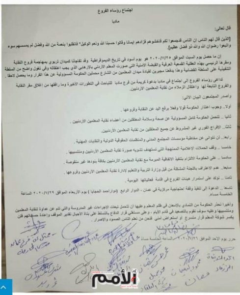 دعا رؤساء لفروع نقابة المعلمين الأردنيين في عدة محافظات إلى اعتصام مركزي على الدوار الرابع (دوار أحمد الحجايا) في العاصمة عمان، في تمام الساعة الخامسة من مساء يوم الأربعاء المقبل الموافق 29 تموز 2020. جاء ذلك في بيان أعقب اجتماعهم في محافظة مادبا، الأحد، أكدوا فيه رفضهم مداهمة فروع النقابة والمقرّ الرئيس بشكل أظهرهم وكأنهم “ارهابيون يجب اعتقالهم”. وطالب البيان الحكومة بالاعتذار عن تلك الاجراءات ورفع اليد عن النقابة وفروعها، والافراج الفوري عن جميع المعتقلين من نقابة المعلمين، ووقف الحملات الاعلامية الممنهجة التي تستهدف تشويه صورة النقابة ومنتسبيها. وحمّل البيان الحكومة كامل المسؤولية عن صحة وسلامة المعتقلين. كما طالب الحكومة بالالتزام بتنفيذ الاتفاقية المبرمة مع نقابة المعلمين بكافة بنودها. وأشار إلى أن رؤساء الفروع لن يتوانوا عن مخاطبة مؤسسات المجتمع المدني والمنظمات الحقوقية الدولية والنقابات المهنية، واستمرار هيئات الفروع في فعالياتها اليومية. ولفت المجتمعون من رؤساء الفروع إلى عدم اعترافهم باللجنة المشكلة من قبل وزارة التربية والتعليم لادارة شؤون النقابة.