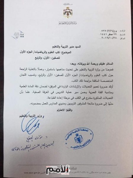 عمان – عممت وزارة التربية والتعليم على مديرياتها في الميدان اليوم الاثنين، التعديلات والإرشادات التي خلصت إليها اللجنة الفنية المشكلة في الوزارة حول كتابي الرياضيات والعلوم للصفين الأول والرابع للعمل بها لضمان دقة المادة العلمية ومناسبة الفئة العمرية وحسن سير عملية التدريس في الغرفة الصفية.