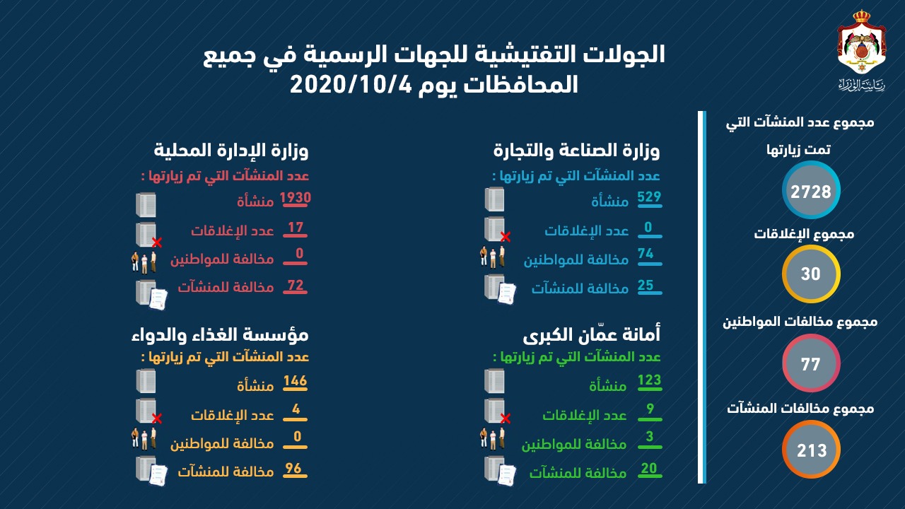 الحكومة: إغلاق 30 منشأة ومخالفة 213 و77 مواطنا شارك أعلنت رئاسة الوزراء اليوم الاثنين عن إغلاق 30 منشأة ومخالفة 213 منشأة اخرى اضافة الى مخالفة 77 مواطنا في مختلف المحافظات لعدم الالتزام بأمر الدفاع 11.وقالت الحكومة إن فرق الرقابة والتفتيش على مدى الالتزام بأمر الدفاع (11) أجرت زيارات لـ 2728 منشأة خلال يوم أمس الأحد.وتاليا تفاصيل الزيارات: Share and Enjoy !Shares