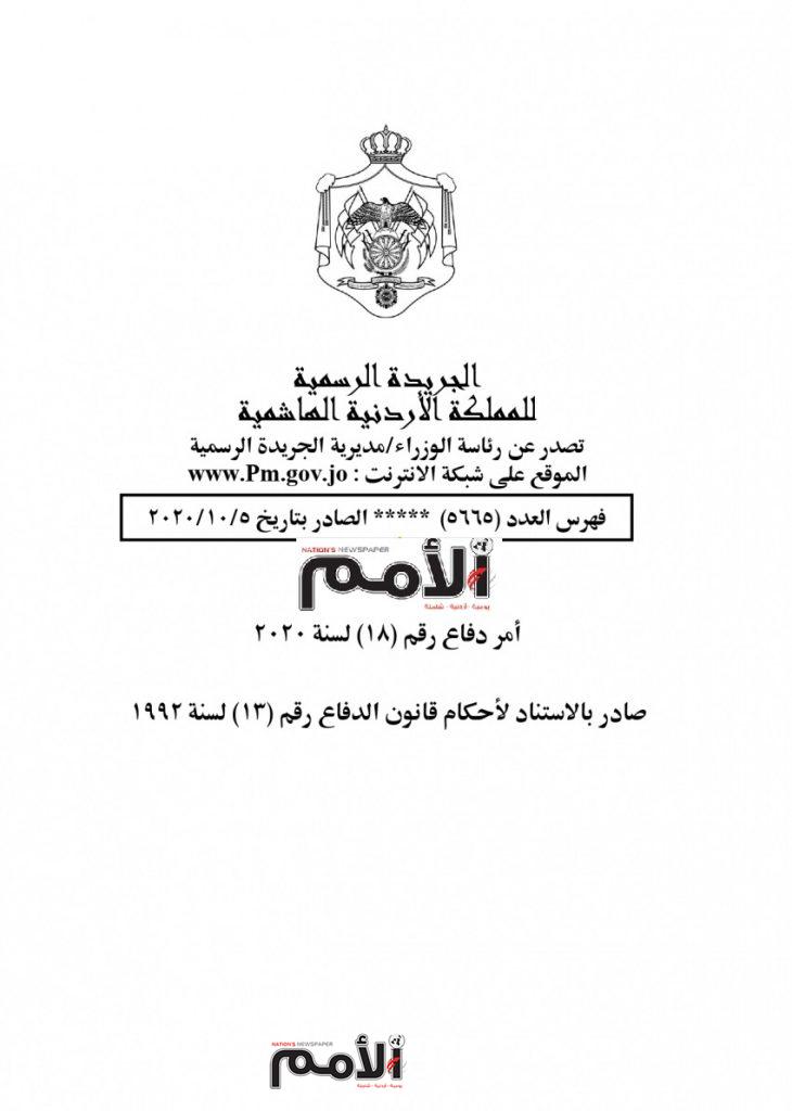 اصدر رئيس الوزراء الدكتور عمر الرزاز، أمر الدفاع رقم 18، واطلعت عليه الامم عبر الجريدة الرسمية.