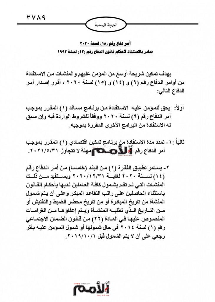 ويهدف أمر الدفاع الجديد إلى تمكين شريحة أوسع من المؤمن عليهم والمنشآت من الاستفادة من أوامر الدفاع رقم 9 و14 و15 لسنة 2020.
