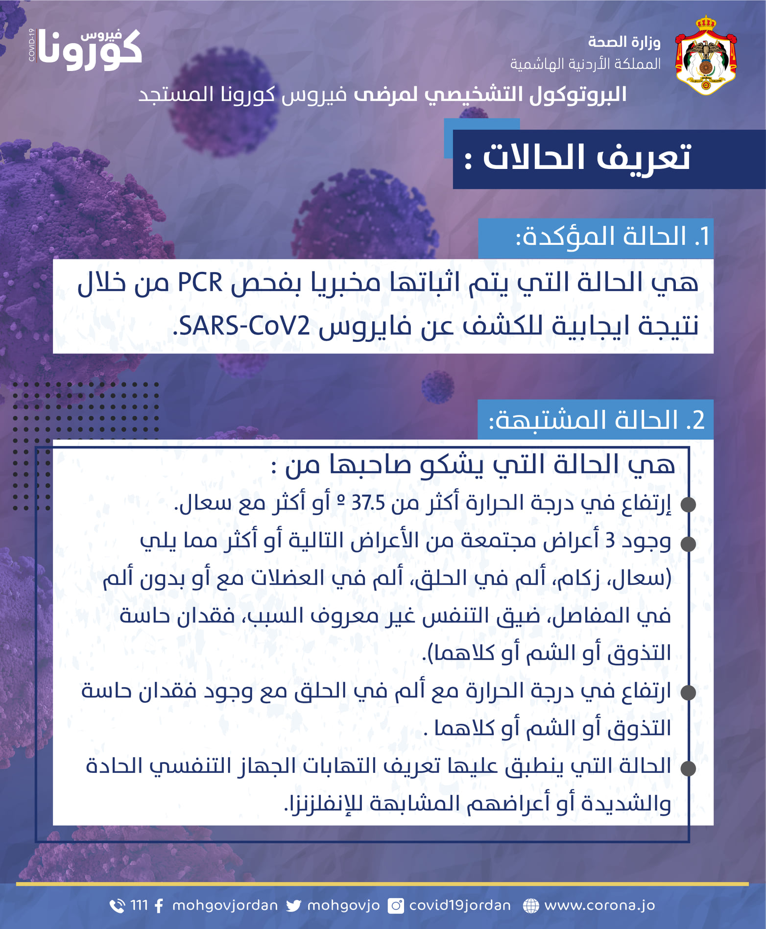 الصحة تنشر البروتوكول التشخيصي لكورونا (تفاصيل) شارك نشرت وزارة الصحة البروتوكول التشخيصي لمرضى فيروس كورونا المستجد COVID – 19.وعرفت الوزارة في البروتكول الذي عممته عبر حسابها الرسمي في فيسبوك مصطلحات “الحالة المؤكدة، والحالة المشتبهة، والحالة المحتملة، والحالة المخالطة، وحالة الوفاة بمرض كوفيد-19”.وتاليا بروتوكول وزارة الصحة: Share and Enjoy !Shares