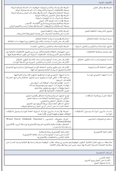 وقالت الرئاسة، إن متطلبات الوظيفة تشمل حماية البيئة وتحسين عناصرها في المملكة والحفاظ على عناصر البيئة والتنوع الحيوي والمساهمة في تحقيق التنمية المستدامة من خلال تطوير استراتيجيات وتشريعات بيئية وإصدار الرخص والموافقات البيئية للأنشطة التنموية وضمان التزامها بالتشريعات والاشتراطات البيئية.