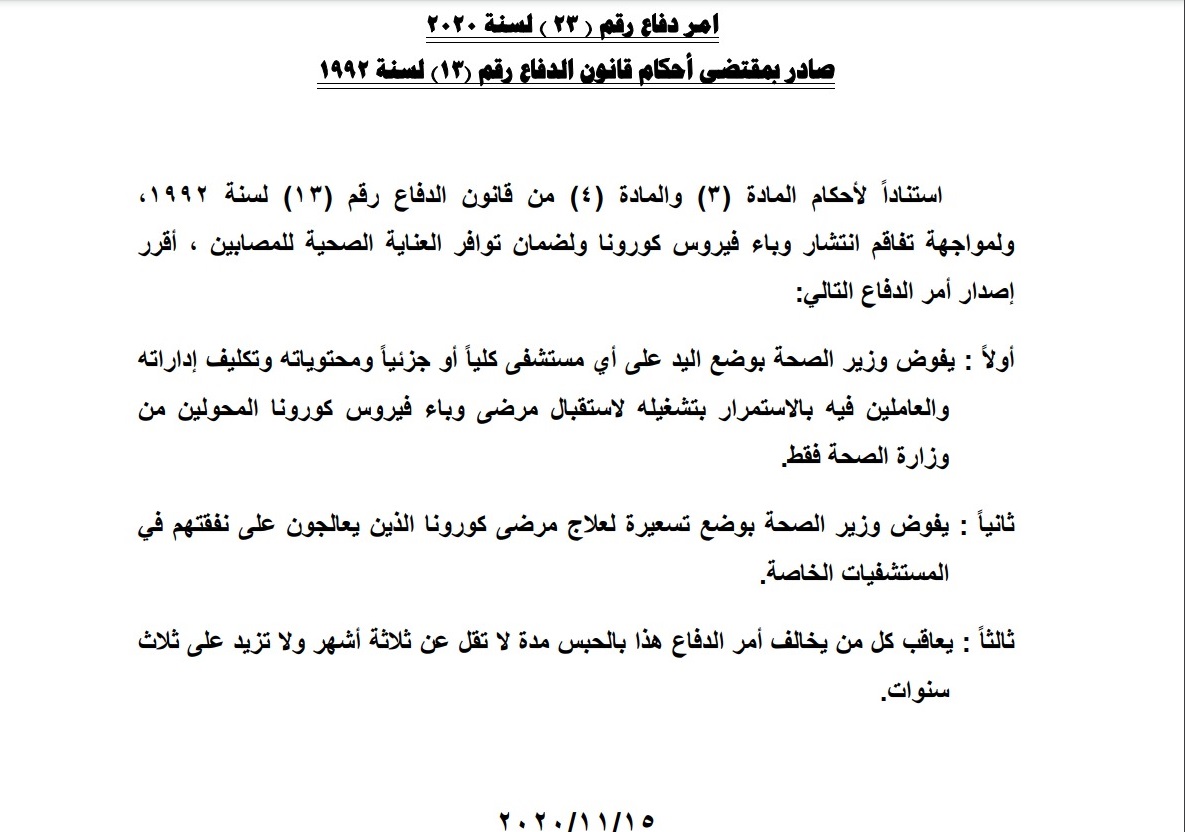 كما يفوض أمر الدفاع 23 وزير الصحة بوضع تسعيرة لعلاج مرضى كورونا الذين يعالجون على نفقتهم في المستشفيات الخاصة.