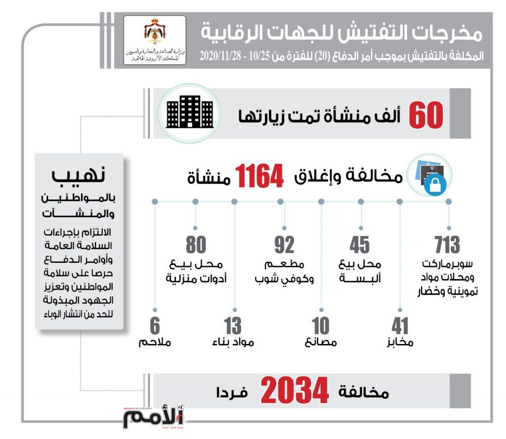 ووفقا للبيانات الإحصائية الصادرة عن وزارة الصناعة و التجارة و التموين باعتبارها الجهة المنسقة لعمل الجهات الرقابية بموجب أمر الدفاع 20 فقد تم مخالفة واغلاق 1164 منشأة من مختلف القطاعات فيما تم تحرير مخالفات بحق 2034 مواطنا لعدم الالتزام بارتداء الكمامة .
