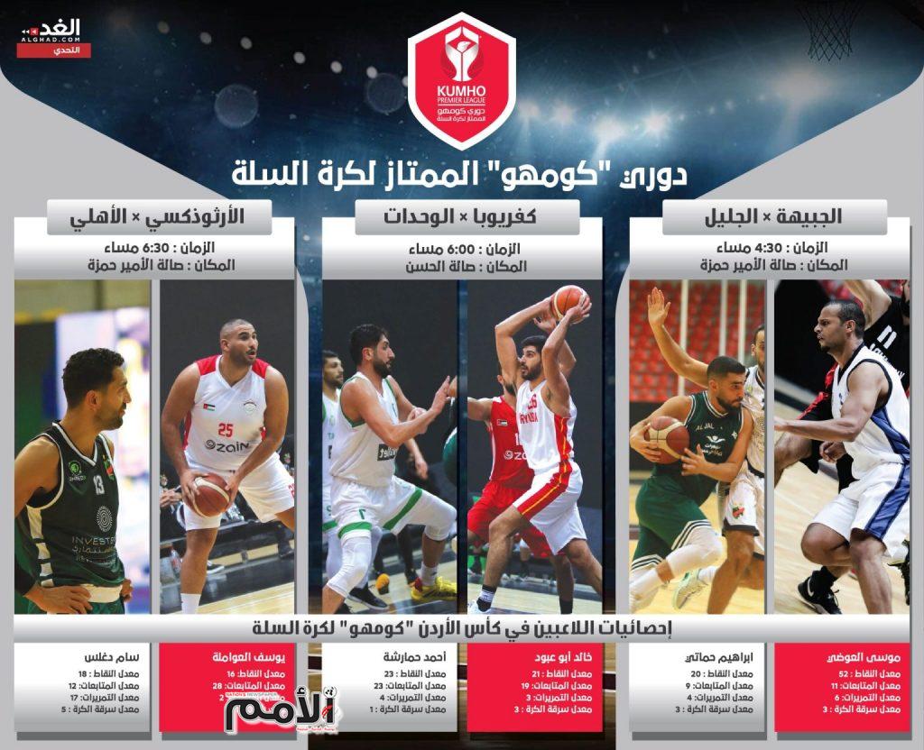 تنطلق عند الساعة 4:30 من مساء اليوم، منافسات بطولة دوري “كومهو” الممتاز لكرة السلة، بلقاء الجبيهة والجليل على صالة الأمير حمزة، تليها مباراة العراقة بين الأرثوذكسي والأهلي عند الساعة 6:30 مساء على الصالة ذاتها، فيما يبدأ الوحدات حملة الدفاع عن اللقب بمواجهة كفريوبا عند الساعة 6:00 مساء على صالة الحسن.