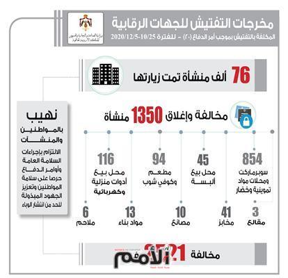ووفقا للبيانات الإحصائية الصادرة عن وزارة الصناعة و التجارة و التموين باعتبارها الجهة المنسقة لعمل الجهات الرقابية بموجب أمر الدفاع 20 فقد تم مخالفة واغلاق 1350 منشأة من مختلف القطاعات فيما تم تحرير مخالفات بحق 2521مواطنا لعدم الالتزام بارتداء الكمامة.