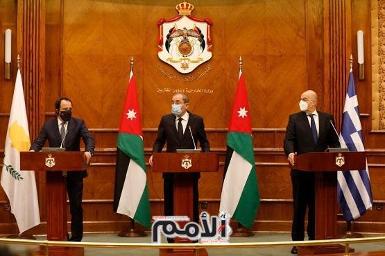 من جانبه اكد وزير الخارجية اليوناني نيكولاس دنديداس أهمية الاجتماع الذي انعقد رغم ظروف كورونا تأكيداً على اهتمام الدولة الثلاثة به. وقال “أود أن أثمن دور الأردن، ونحن نعلم التحديات الكبيرة التي تواجه الأردن ليس فقط بسبب جائحة كورونا ولكن أيضـاً بسبب استضافة الأردن لعدد كبير من اللاجئين”.