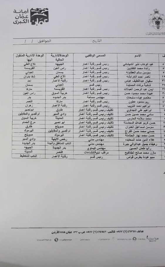تنقلات في أمانة عمان (أسماء) شارك وافق أمين عمان يوسف الشواربة على تنقلات في أمانة عمان الكبرى.وشملت التنقلات مدراء ورؤساء أقسام ورؤساء شعب.وتالياً الأسماء: Share and Enjoy !Shares