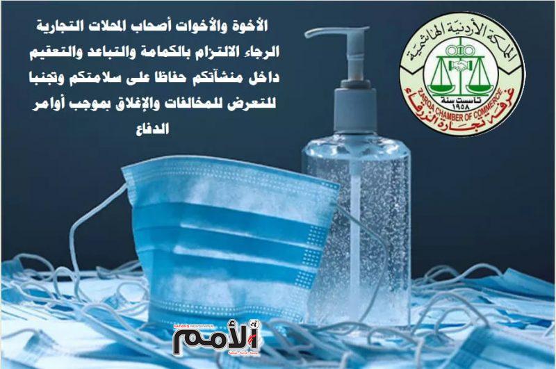 دعا رئيس غرفة تجارة الزرقاء حسين شريم أصحاب المحلات التجارية إلى الالتزام بأحكام أوامر الدفاع والتأكيد على ضرورة ارتداء الكمامة والتقيد بمسافات التباعد المقررة داخل المنشآت التجارية، وذلك حفاظا على الصحة العامة ومنعا لانتشار وباء كورونا وتجنبا للغرامات والعقوبات التي تصل حد الإغلاق المؤقت للمنشآت المخالفة.