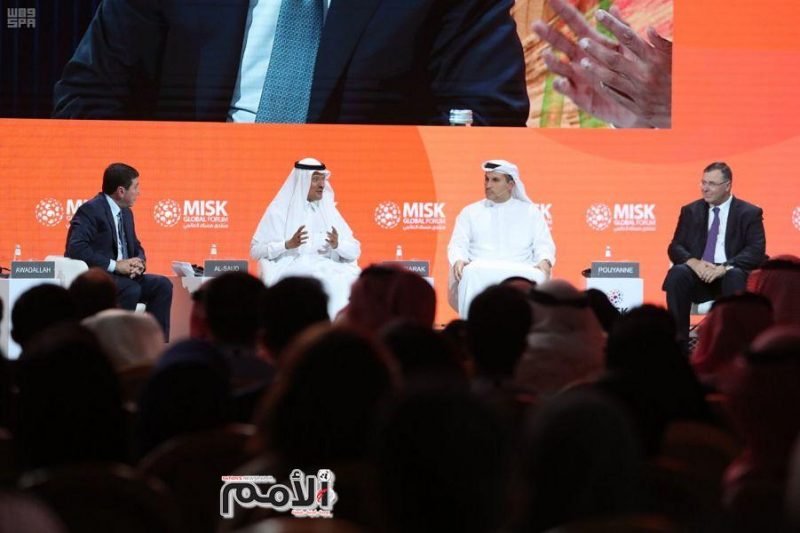 وجاءت الجلسة الافتتاحية بعنوان “صناعة الغد ووظائف المستقبل” بمشاركة الأمير عبد العزيز بن سلمان بن عبد العزيز وزير الطاقة السعودي، والرئيس التنفيذي للمجموعة العضو المنتدب في شركة “مبادلة” للاستثمار في الإمارات خلدون المبارك، ورئيس مجلس الإدارة والرئيس التنفيذي لشركة “توتال” في فرنسا باتريك بوياني.