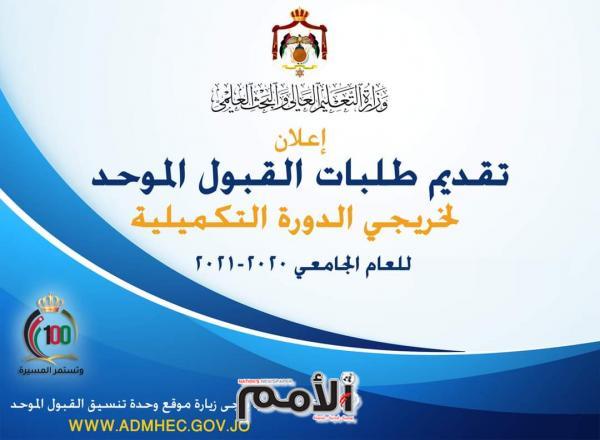 أعلنت وحدة تنسيق القبول الموحد/ التابعة لمجلس التعليم العالي في وزارة التعليم العالي والبحث العلمي بأن عملية تقديم طلبات الالتحاق الإلكترونية في الجامعات الأردنية الرسمية لخريجي الدورة التكميلية للعام 2020 / 2021 ستبدأ اعتباراً من الساعة الثامنة صباح يوم الاثنين الموافق 8 / 2 / 2021 وحتى الساعة الثانيـة عشرة ليلاً من يوم الخميس الموافق 11 / 2 / 2021 ، وذلك من خلال الموقع الالكتروني للوحدة ww.admhec.gov.jo ، حيث يقوم الطالب الأردني (الحاصل على معدل 65% فما فوق) بدفع رسم تقديم طلب الالتحاق في الجامعات الأردنية الرسمية والبالغ قيمته (15) ديناراً أردنياً، باستخدام آلية الدفع الالكتروني عن طريق “خدمة تسديد الفواتير من البنك المركزي الأردني” إي-فواتيركم (eFAWATEERcom) ، وبعد ذلك سيتم إرسال رسالة نصية إلى رقم هاتف الطالب الخلوي تحتوي على رمز المستخدم (UserID) والرمز السري (Password) الضروريان للدخول إلى برمجية تقديم طلب الالتحاق، وهذه الخدمة متوفرة من خلال قنوات الدفع التي تطبق خدمة إي-فواتيركم (eFAWATEERcom) ونذكر من أهمها: مكاتب البريد الأردني المنتشرة في كافة أنحاء المملكة (حسب القائمة المعلنة على موقع الوحدة)، الحساب البنكي الشخصي على الانترنت، فروع البنوك الأردنية وأجهزة الصراف الآلي التابعة لها، محلات الصرافة المعتمدة (وللتعرف أكثر على قنوات الدفع المعتمدة، وآلية شراء طلب الالتحاق الرجاء زيارة الموقع الإلكتروني لوحدة تنسيق القبول الموحد ).