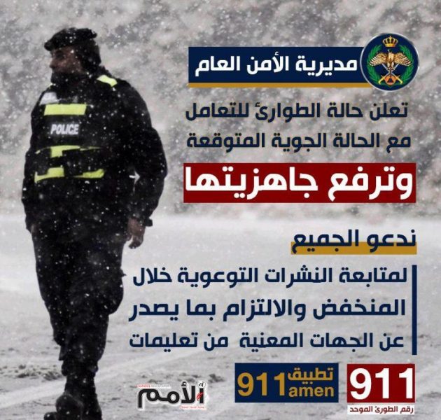 - ندعو الجميع لمتابعة النشرات التوعوية خلال المنخفض والالتزام بما يصدر عند الجهات المعنية من تعليمات . بين الناطق الإعلامي باسم مديرية الأمن العام جاهزية المديرية بكافة تشكيلاتها من شرطه ودفاع مدني وقوات درك سواءً على صعيد الكوادر البشرية المدربة التدريب الإحترافي أو على صعيد الآليات والمعدات المتخصصة وإدامة غرف العمليات الرئيسية والفرعية للتعامل مع المنخفض الجوي المتوقع . ودعا الناطق الإعلامي الإخوة المواطنين إلى ضرورة انتهاج السلوك السليم خلال المنخفض الجوي وذلك من خلال إتباع النصائح والإرشادات التالية :