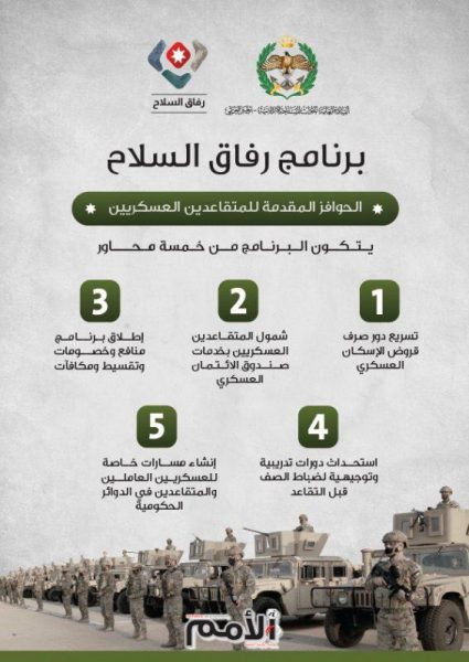 ولفت حجازي ، الثلاثاء ، ، الذي يبث عبر أثير إذاعة القوات المسلحة الأردنية “راديو هلا” ، أن المبادرة تهدف إلى تقديم خدمات نقدية لأفراد القوات المسلحة والأجهزة الأمنية ، حيث سيصار إلى تقديم ذات الخدمات إلى المتقاعدين العسكريين .