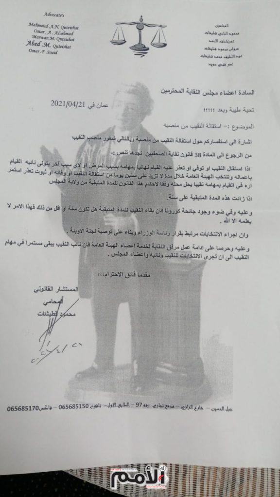 وكان قبيل الاجتماع قد استعرض المستشار القانوني المحامي محمود قطيشات الوضع القانوني بعد استقالة نقيب الصحفيين الزميل راكان السعايدة التي قدمها مكتوبه حرصا على سلامة الإجراءات القانونية التي تنسجم مع قانون النقابه والتي أوضح فيها أنه حسب الماده ٣٨ من قانون نقابة الصحفيين الاردنيين انه إذا استقال النقيب أو توفي أو تعذر عليه القيام نهائيا بمهامه بسبب المرض أو لأي سبب آخر يتلى نائبه القيام بأعماله وتنتخب الهيئة العامة خلال مدة لا تزيد على ستين يوما من استقالة النقيب أو وفاته أو ثبوت تعذر استمراره في القيام بمهامه نقيبا يحل محله وفقا لأحكام هذا القانون للمدة المتبقية من ولاية المجلس إذا زادت هذه المدة المتبقية على سنة” وعليه وفي ضوء بقاء النقيب للمدة المتبقيه هل تكون سنة أو أقل غير معروف وان اجراء الانتخابات مرتبط بقرار رئاسة الوزراء وبناء على توصية لجنة الاوبئة حرصا على إدامة عمل النقابة لخدمة اعضاء الهيئة العامة فإن نائب النقيب يبقى مستمرا في مهام النقيب إلى أن تجرى الانتخابات النقيب وأعضاء المجلس.