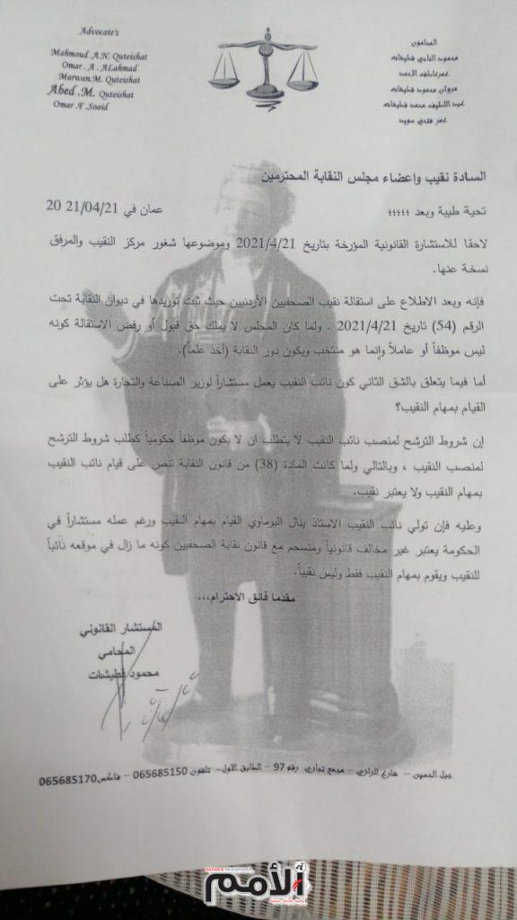 واشار قطيشات انه فيما يتعلق بمدى تأثير كون نائب النقيب يعمل مستشارا لوزير الصناعة والتجارة بالقيام بمهامه كنقيب فإن تولي نائب النقيب البرماوي القيام بمهام النقيب رغم عمله مستشارا في الحكومة يعتبر غير مخالف قانونيا ومنسجم مع قانون نقابة الصحفيين كونه ما زال في موقعه نائبا النقيب ويقوم بمهام النقيب فقط وليس نقيبا.