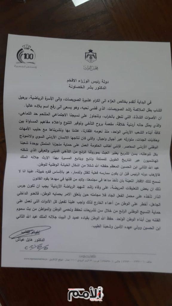 النائب هايل عياش يوجه كتاب الى بشر الخصاونه