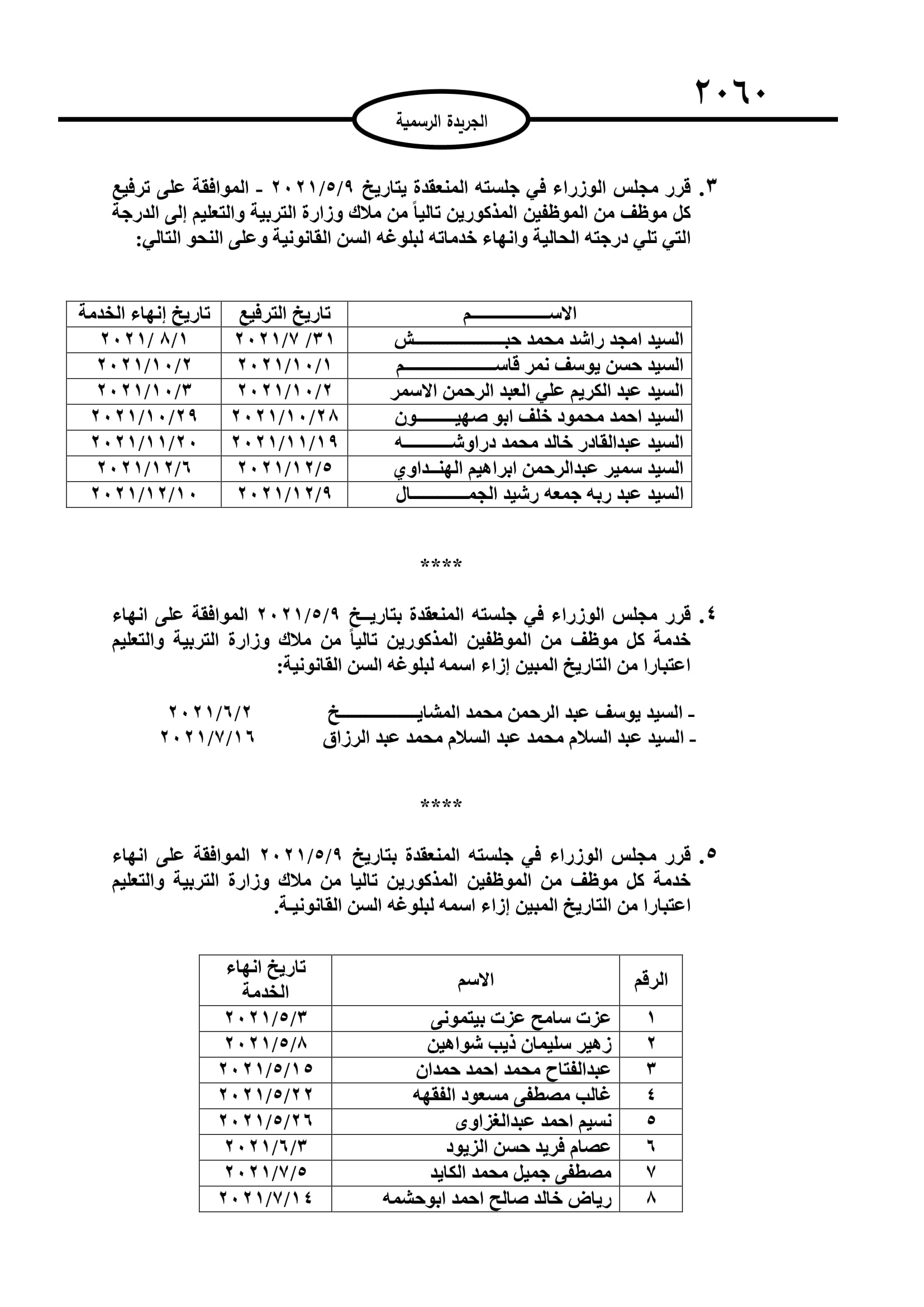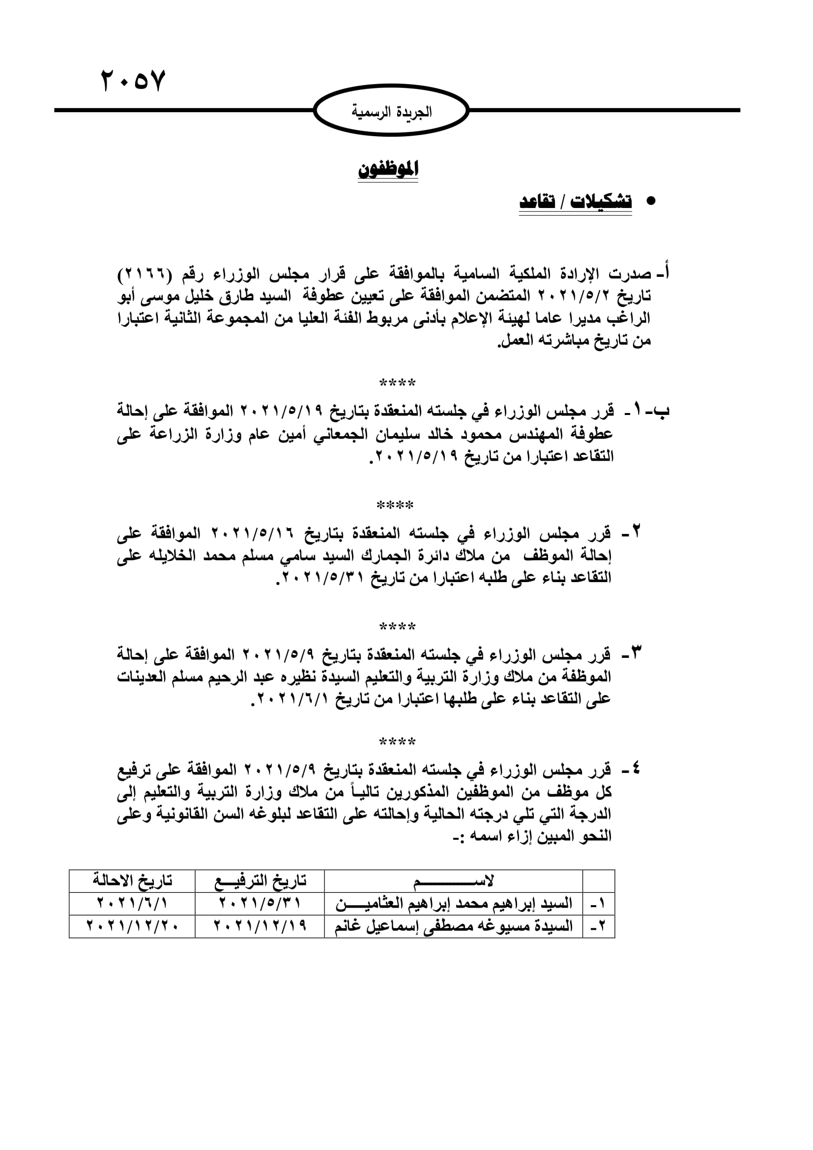 موظفون حكوميون إلى التقاعد شارك صدر في عدد الجريدة الرسمية اليوم الثلاثاء قرارات مجلس الوزراء بإحالة عدد من موظفي الدولة الى التقاعد، وانهاء خدمات اخرين.وتاليا الاسماء: Share and Enjoy !Shares