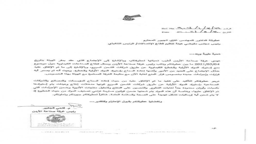 – قالت غرفة صناعة الأردن، الأربعاء، إن هيئة تنظيم قطاع الاتصالات، وافقت على نقل المواد الكيميائية والخطرة مع شركات البريد السريع.