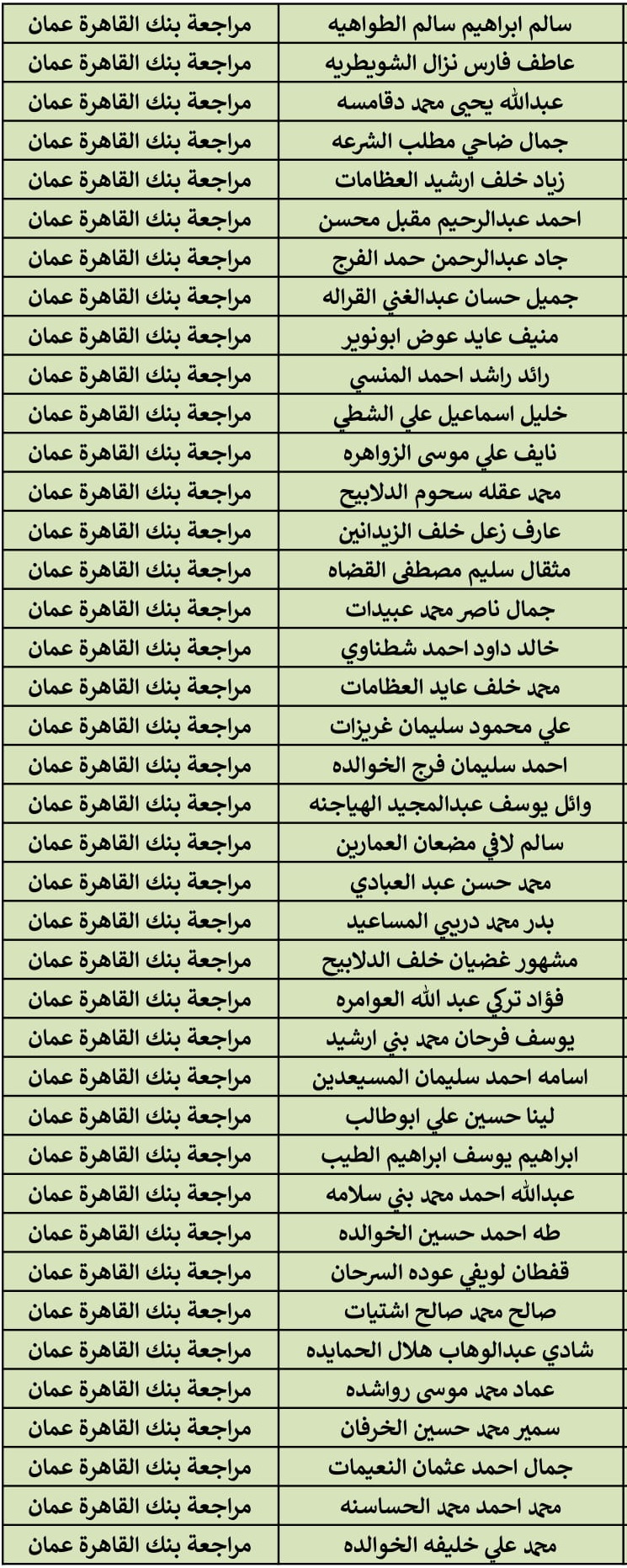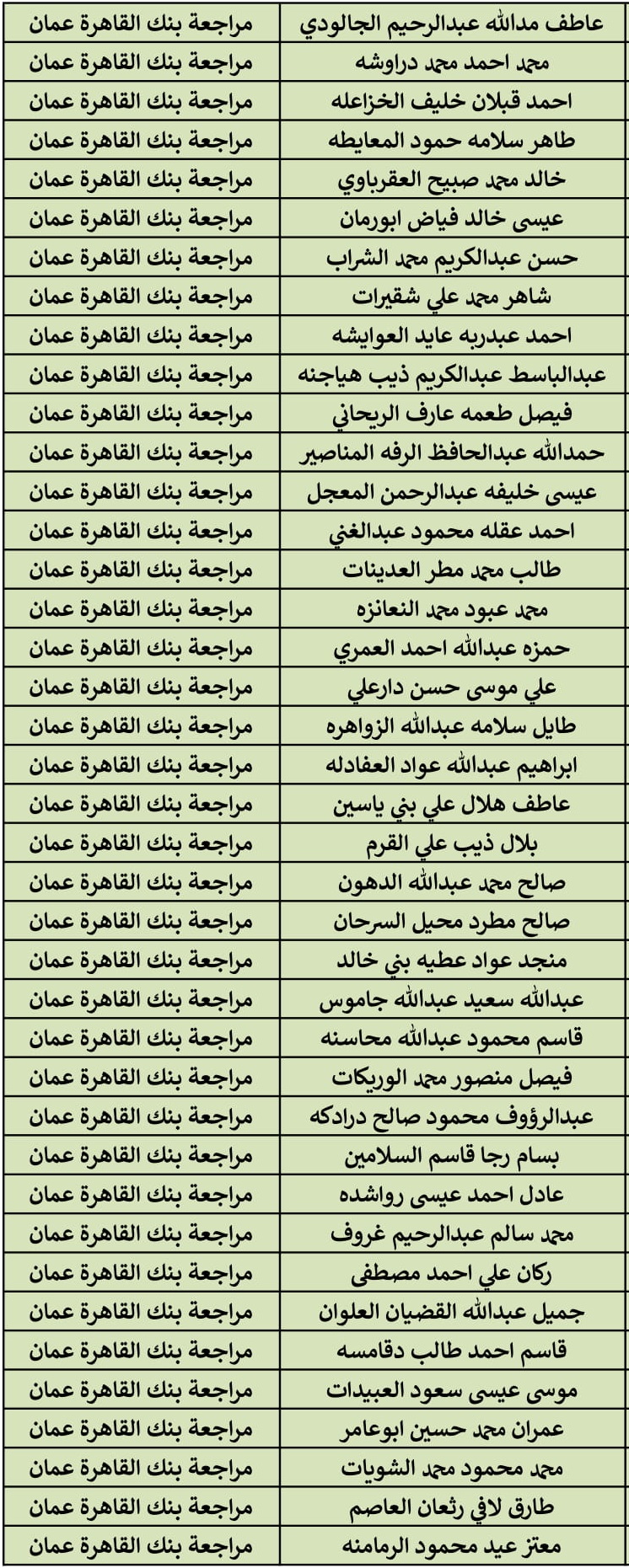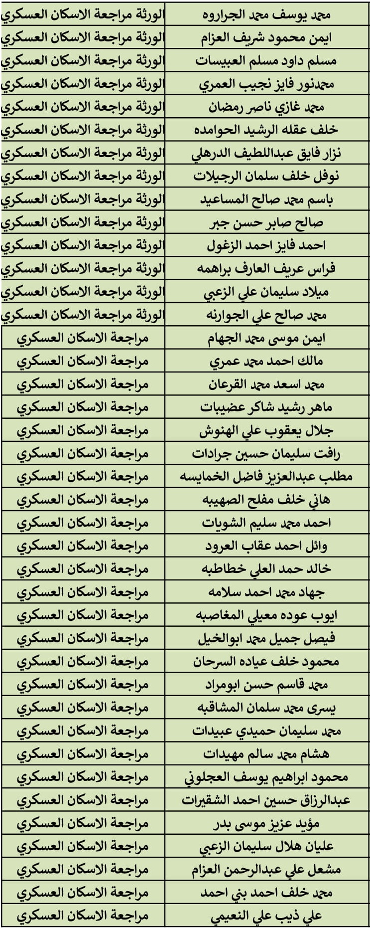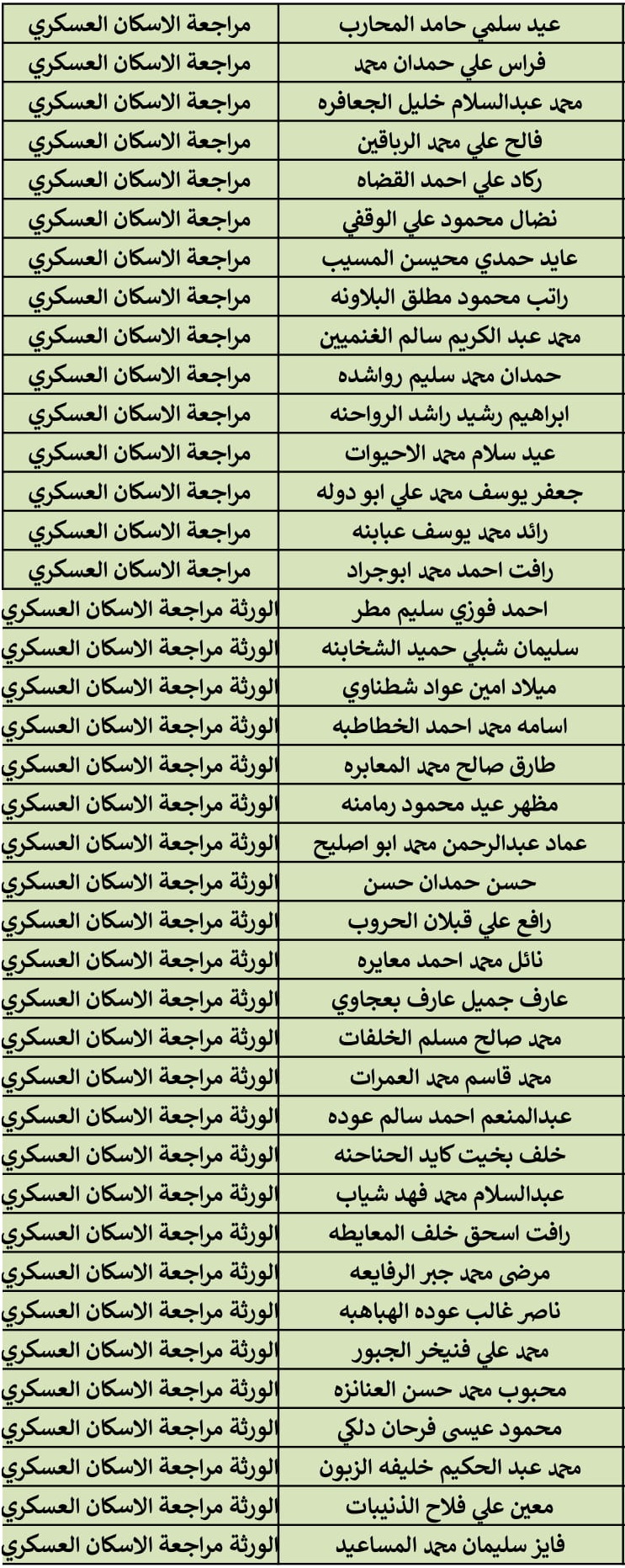 أعلنت القيادة العامة للقوات المسلحة الأردنية – الجيش العربي/ مديرية مؤسسة الإسكان والأشغال العسكرية بأن ضباط الصف والأفراد المبينة أسماءهم أدناه قد استحقوا الحصول على القرض من صناديق الإسكان العسكري مبيناً كشف بأسماء المستحقين لقرض صندوق الإسكان العسكري لدفعة شهر حزيران لعام 2021.