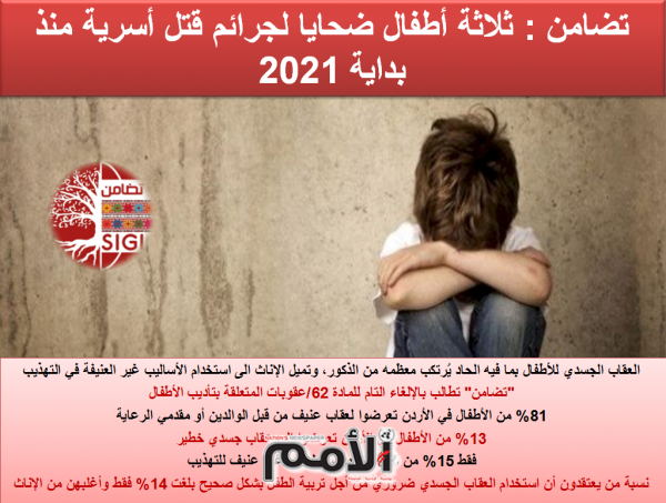 ثلاثة أطفال ضحايا لجرائم قتل أسرية منذ بداية 2021، فقد أعلن يوم أمس 28/6/2021 عن مقتل طفل في السابعة من العمر إثر تعرضه للضرب والحرق عن طريق سكب المياه الساخنة عليه من قبل والديه بالتبني، كما أقدم أب يوم 6/3/2021 على قتل طفلتيه (سنتان و 3 سنوات) بواسطة آداة حادة في البادية الجنوبية.